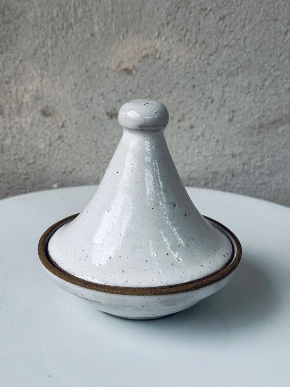 Saleiro marroquino em cerâmica artesanal, modelado com argila tabaco, o que confere um tom rústico e único à peça. As pintas naturais da argila são realçadas pelo esmalte branco brilhante, criando um contraste sofisticado e moderno. Este saleiro, além de bonito, é durável e resistente.
