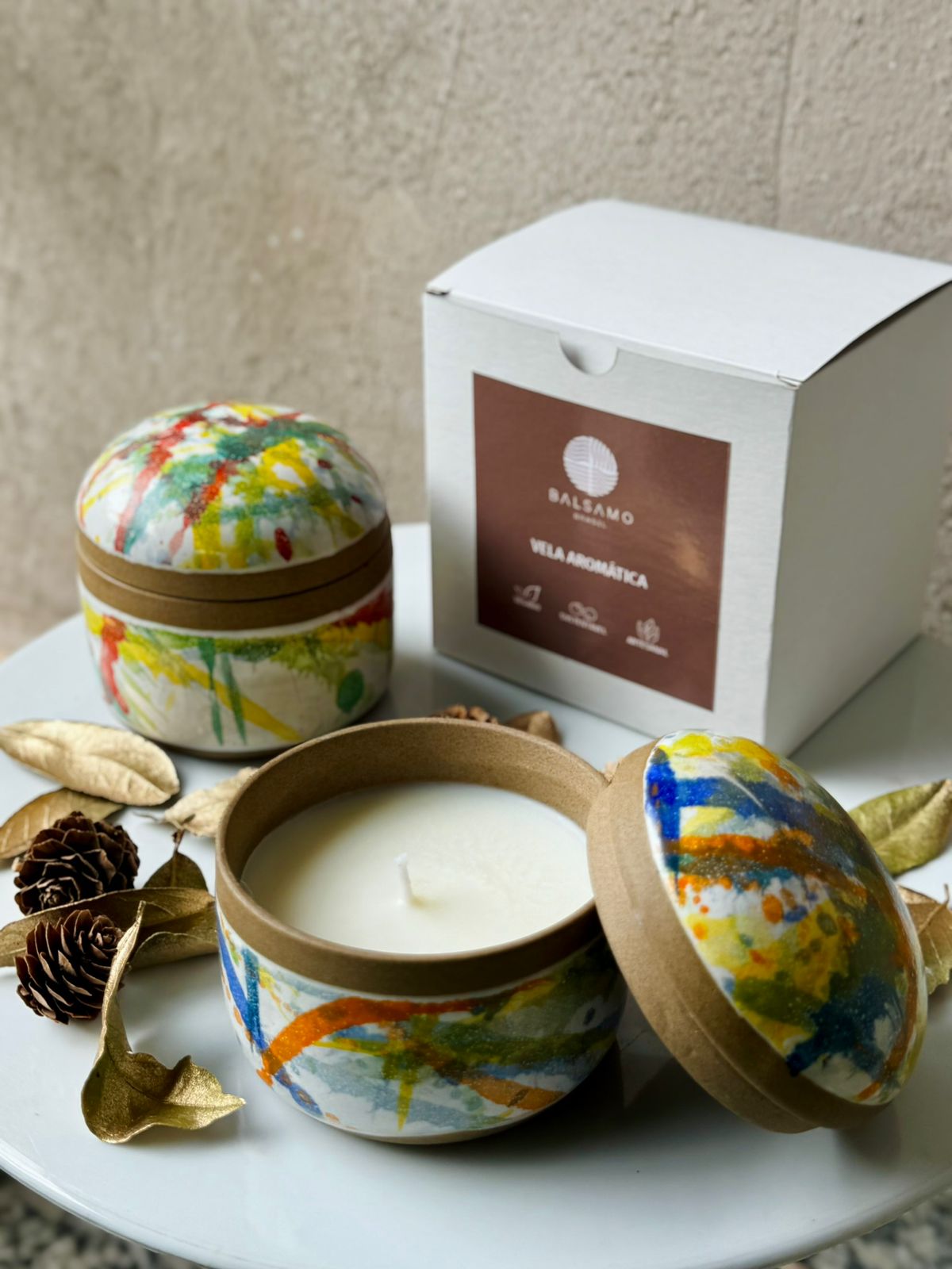 A vela é acondicionada em uma caixa de cerâmica artesanal com tampa, pintada à mão com grafismos coloridos, que transforma a peça em um objeto de decoração único e cheio de personalidade.